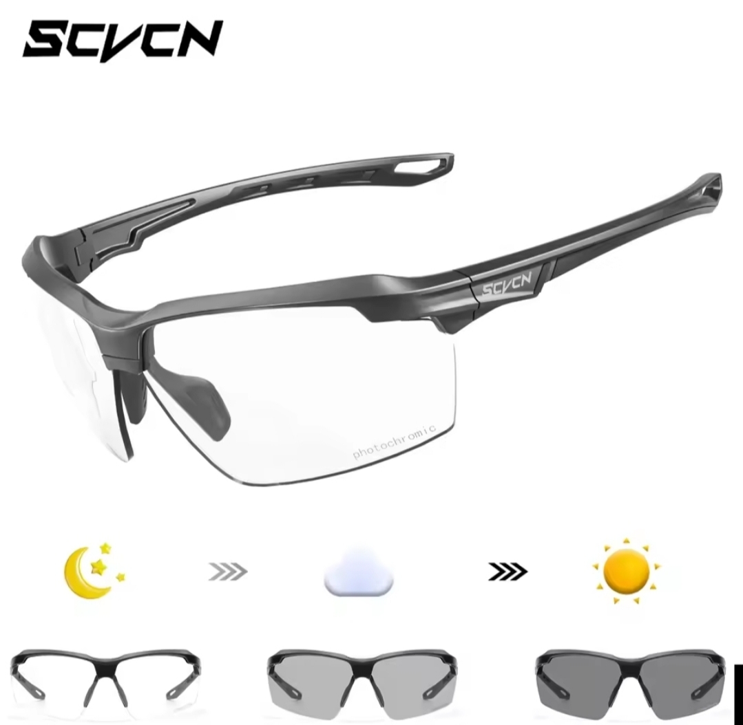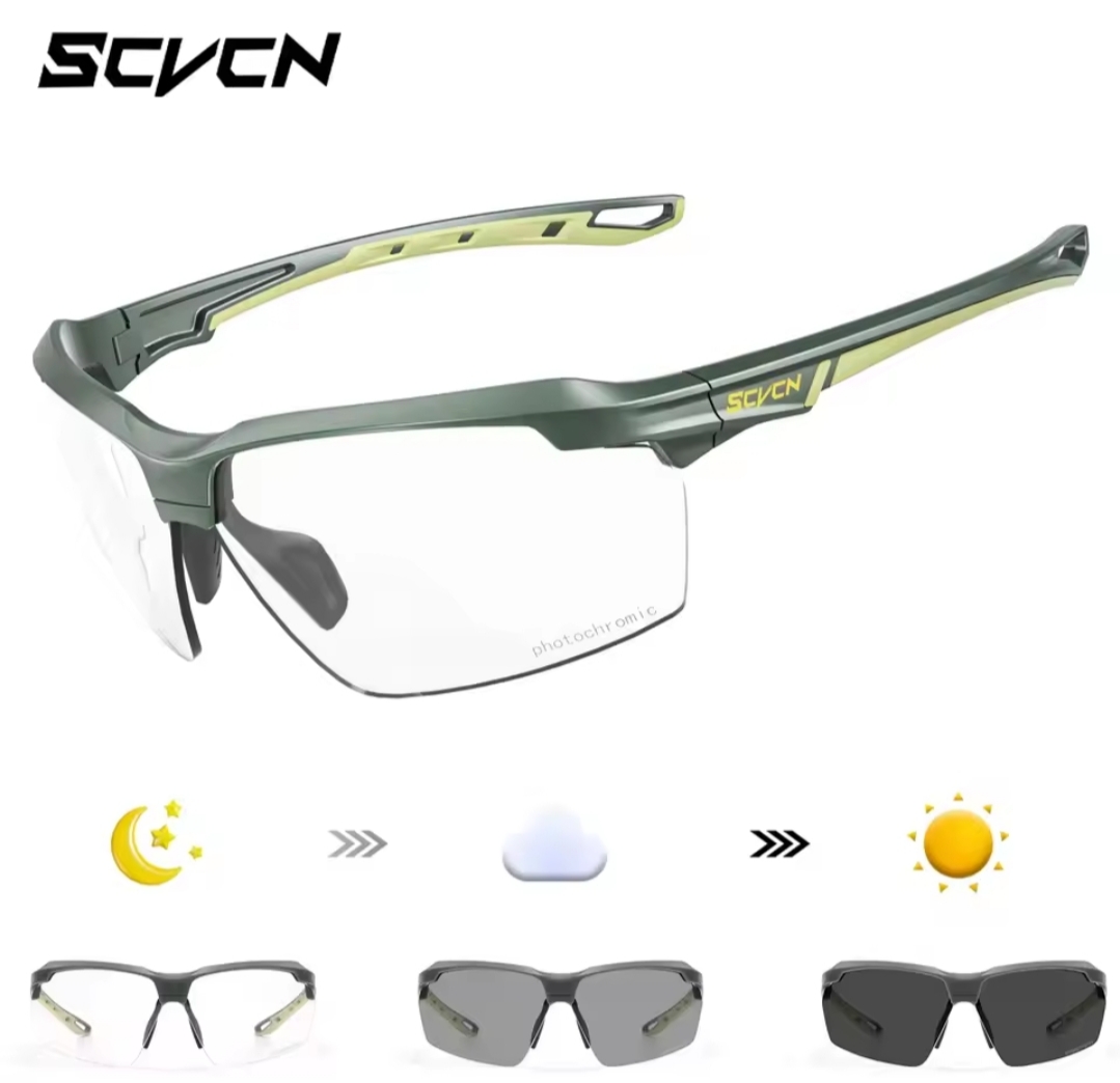 Óculos táticos SCVCN Haste verde flexível de design moderno justo a face Lentes fotocromáticas As lentes fotocromáticas são conhecidas por ajustar a cor da lente consoante a luminosidade, isso acontece graças a moléculas sensíveis a luz solar e raios ultravioleta Bolsa tática preta com fecho, interior macio Óculos SCVCN com hastes verdes, lentes fotocromáticas que escurecem com a luz solar e bolsa tática verde