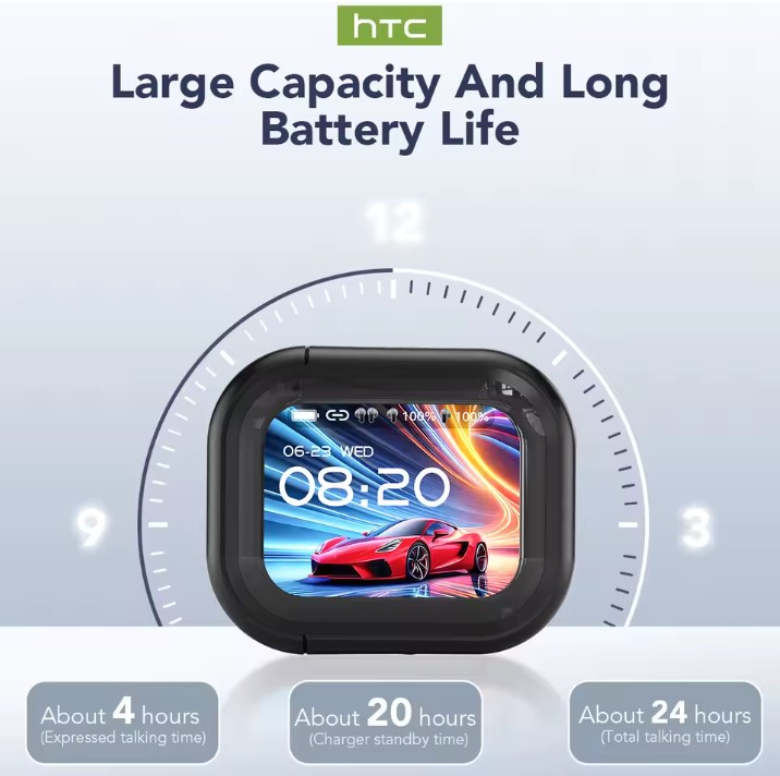 Caixa com ecrã personalizado e muitas funções, controlo de musicas e volume assim como nos auriculares funções por toque;